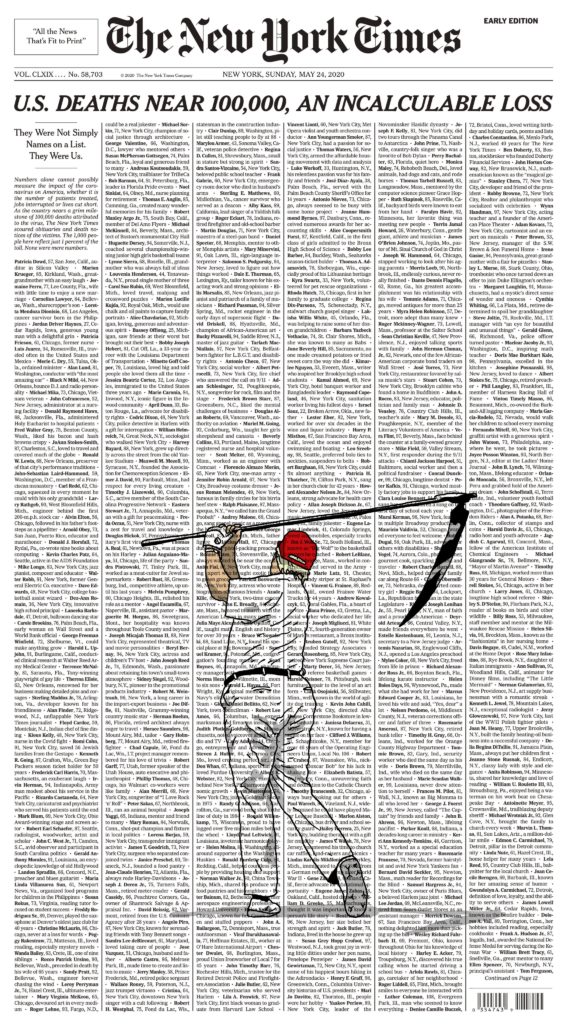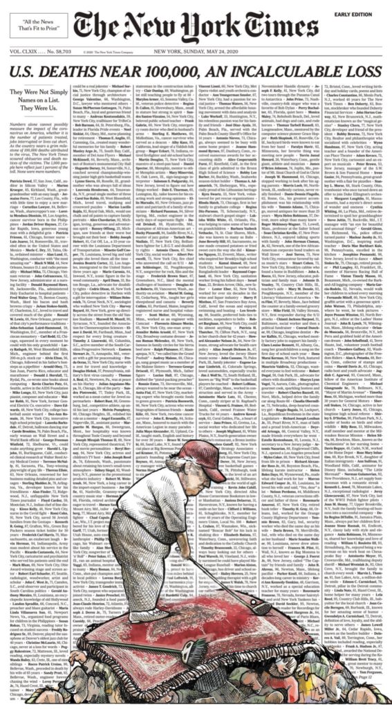 The COVID-19 has cost so many more lives in the United States, than 9/11, and Vietnam War together. The New York Times published the names of 1,000 people who died of the coronavirus on the front page of its paper edition.